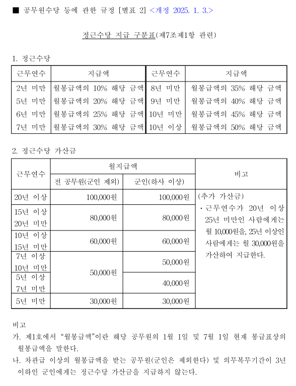 2025년부터는 개정되어서 1년 미만(기존 미지급)도 정근수당을 받을 수 있게 되었어요