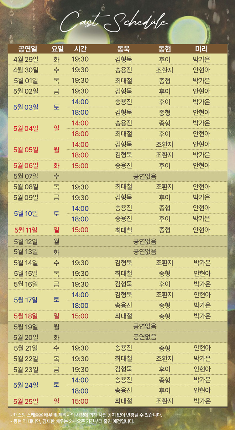 공연 시간: 수~금 오후 8시 / 토요일 오후 4시, 7시 30분 / 일요일 오후 4시 (월, 화 공연 없음)
