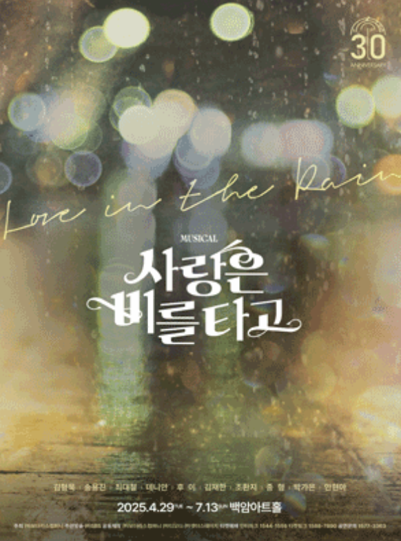 뮤지컬 〈사랑은 비를 타고〉 30주년 기념 공연이 2025년 4월 29일부터 7월 13일까지 서울 백암아트홀에서 펼쳐진답니다. 약 2개월 반 동안 진행되는 이번 공연, 놓치지 말고 꼭 관람하세요!