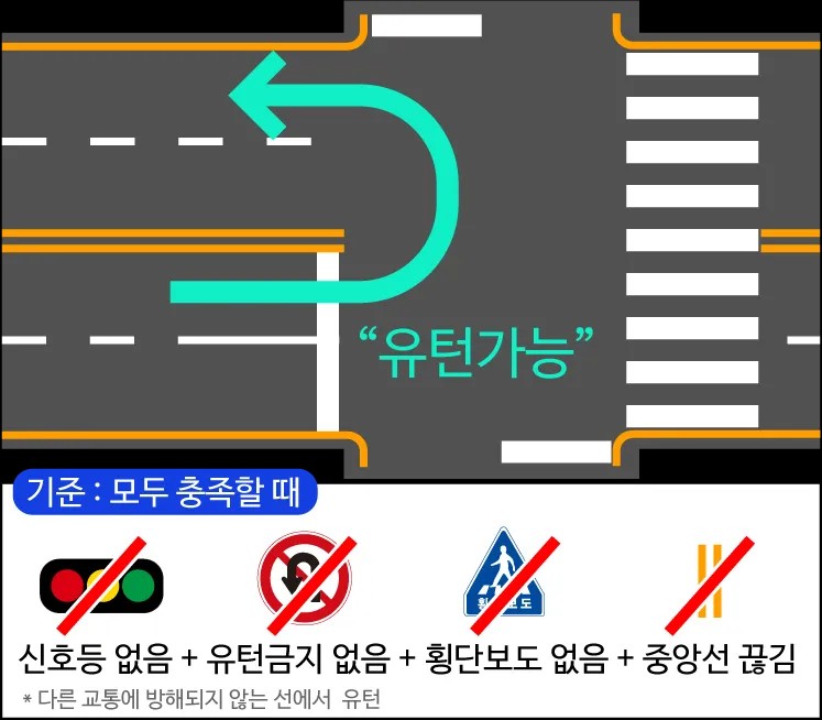 교차로에서 중앙선이 끊긴 곳, 횡단보도가 없는 곳, 차량용 신호등이 없거나 유턴 금지 표지판이 없는 곳에서는 유턴이 가능해요. '이런 곳에서는 유턴을 어떻게 해야 한다'는 규정이 명시되어 있는 것이 아니라, 금지하는 규정이 따로 없기 때문에 유턴이 가능한 것이죠.