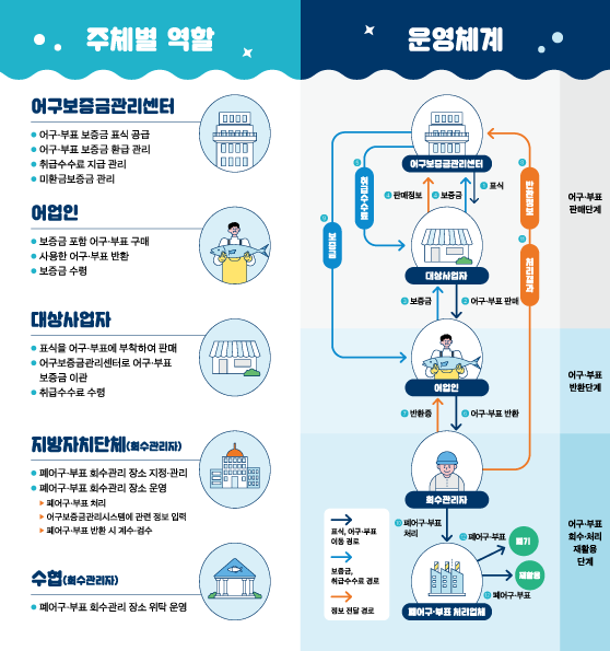 보증금대상사업자인 어구 생산업체와 수입업자들은 반드시 어구보증금이 포함된 가격으로 어구를 판매해야 하며, 바코드가 포함된 어구표식을 부착해야 해요. 이를 통해 정품 어구임을 확인할 수 있고, 환급 시에도 정확한 확인이 가능합니다. 어선의 선적항과 위판항 근처에서 쉽게 구매할 수 있도록 유통망도 구축되어 있어요.