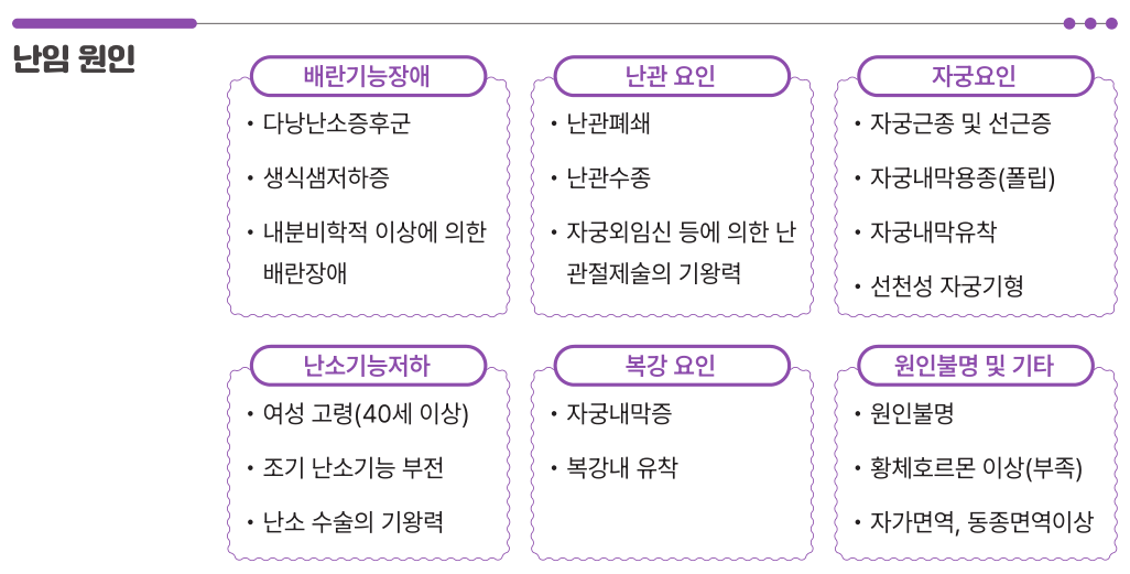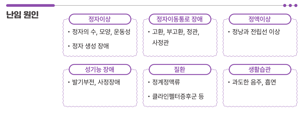 난임의 원인은 배란장애, 난소기능저하, 난관문제, 자궁문제, 자궁내막증 등 여성 요인과 정자형성 장애, 정자 이동과정의 장애 등 남성 요인으로 구분할 수 있어요. 스트레스, 비만, 흡연, 환경호르몬, 연령 증가 등도 난임에 영향을 미칠 수 있어요.