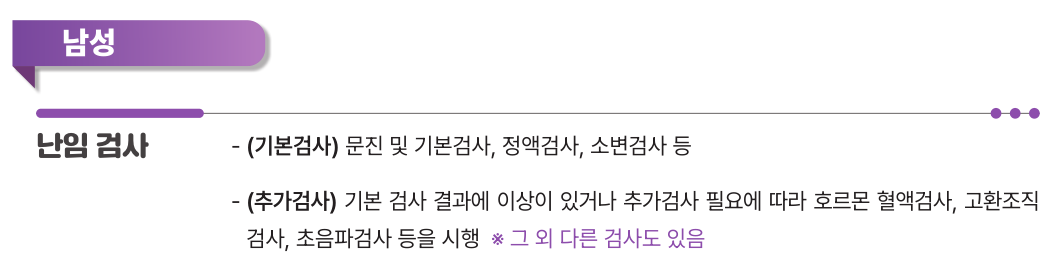 남성은 정액검사, 문진 및 기본검사, 호르몬검사, 초음파검사 등을 받고, 여성은 산부인과 진료, 호르몬검사, 자궁난관조영술, 초음파검사, 자궁내막검사, 자궁경·복강경검사 등을 받게 돼요.