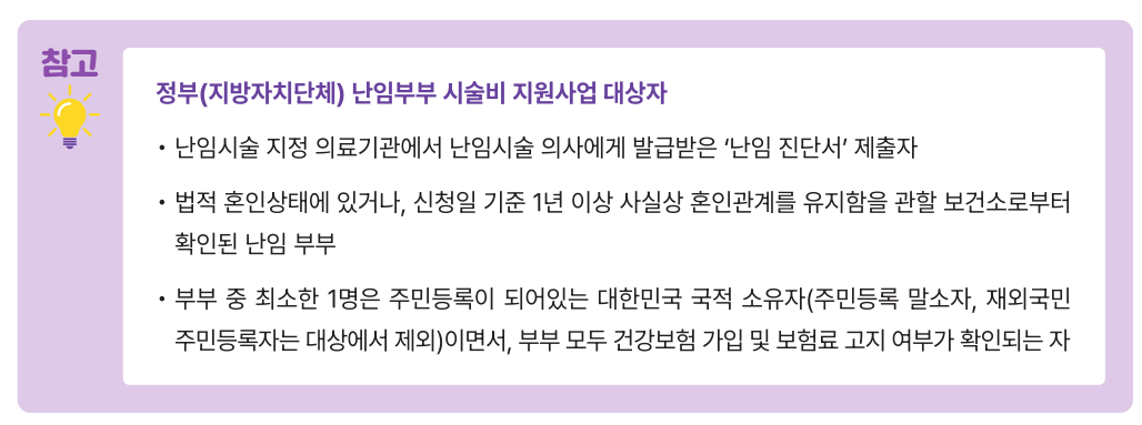| 인공수정시술 | 출산 당 5회(건보), 25회(서울시) | 30% | 1회당 최대 30만원 |