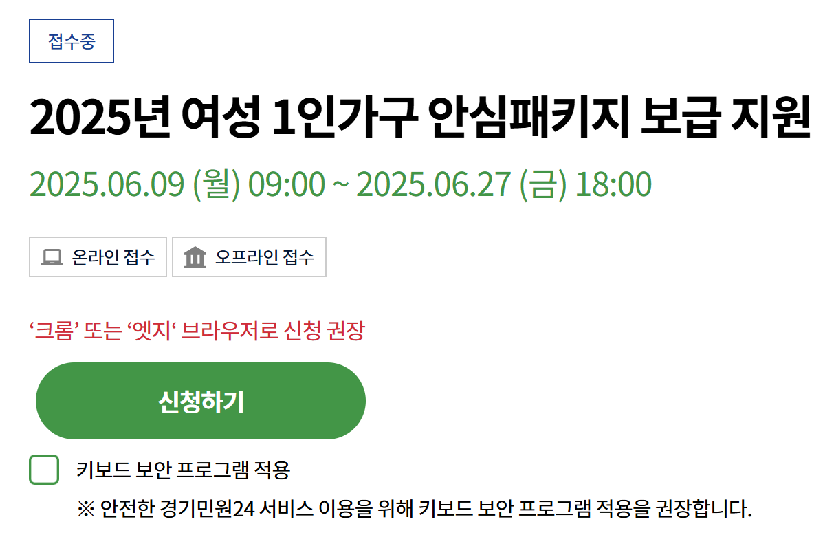 2025년 경기도 여성안심패키지는 6월 9일부터 27일까지 일괄 접수하지만, 시군별로 접수 일정이나 지원 규모, 물품 구성에 차이가 있을 수 있어요.