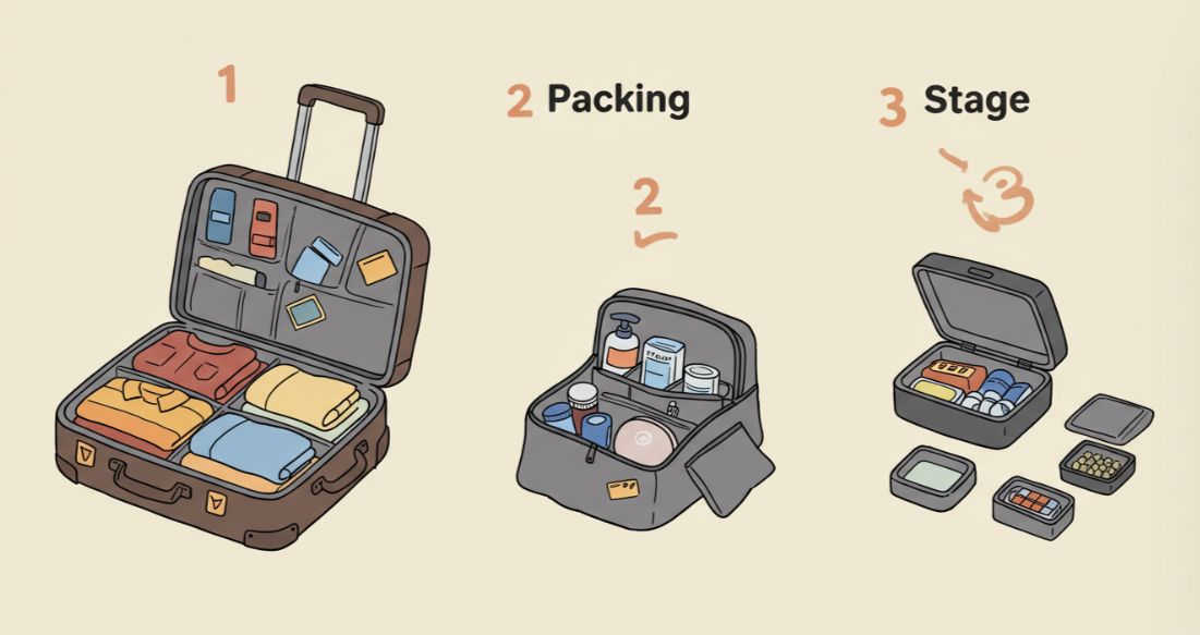 짐을 쌀 때는 여행지와 일정, 계절, 숙소 환경을 고려해 꼭 필요한 것만 챙기는 것이 중요해요. 짐 정리 팁으로는 큰 물건부터 먼저 넣고, 작은 물건은 지퍼백이나 위생백에 분류해서 넣으면 좋아요. 여행 짐 챙길 때 순서를 정해두면 빠르고 효율적으로 준비할 수 있습니다. 예를 들어, 옷과 신발을 먼저 챙기고, 세면도구와 미니 화장품, 보조배터리, 충전기, 상비약, 접이식 우산, 물티슈, 손소독제 순으로 정리하면 실수 없이 준비할 수 있어요.