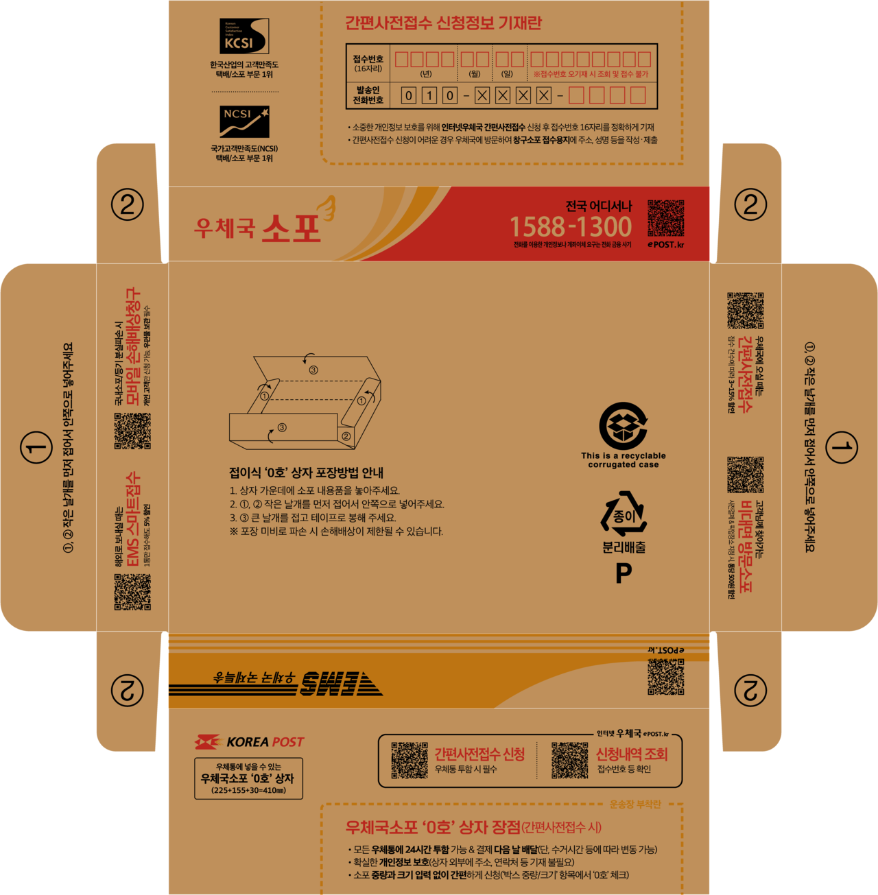 • 가로 22.5cm, 세로 15.5cm, 높이 3cm, 총 길이 41cm 이내의 접이식 소포 상자