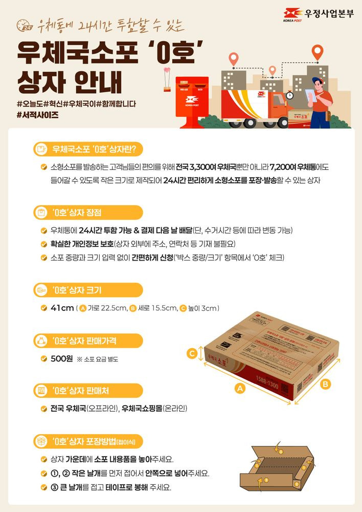 우체국 0호상자, 이제 집 근처 우체통으로 소형 소포를 쉽고 빠르게 보낼 수 있어요.