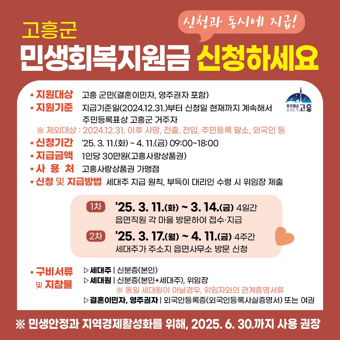 2025년 고흥군이 군민의 생활 안정과 지역 경제 활성화를 위해 마련한 지원금이에요.