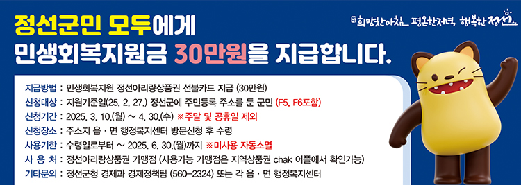 지원 대상은 2025년 2월 27일 기준으로 정선군에 주민등록이 되어 있는 군민과 외국인 중 결혼이민자 및 영주권자를 포함해 약 3만 4천 명이에요.